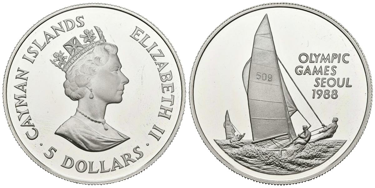ISLAS CAIMAN. 5 Dollars. (Ar. 28,31g/39mm). 1988. Juegos Olímpicos de Seúl. (Km#143). PROOF. Rayitas en anverso. Muy rara.