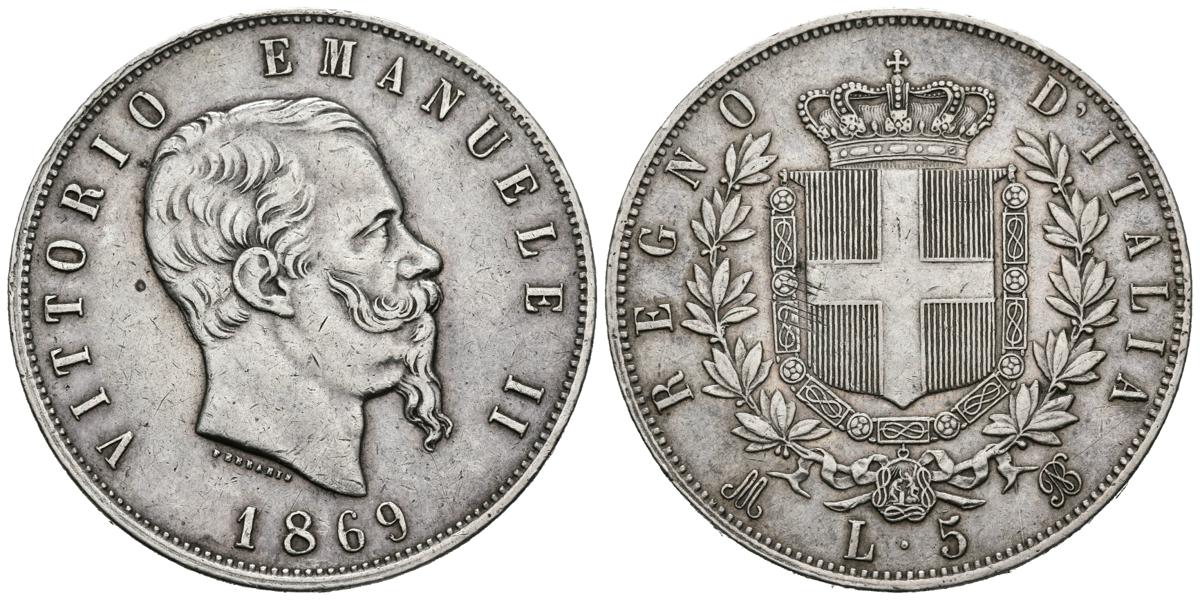 ITALIA. 5 Liras. (Ar. 24,92g/37mm). 1869. Victor Manuel II. Milán. (Km#8.3). MBC+.