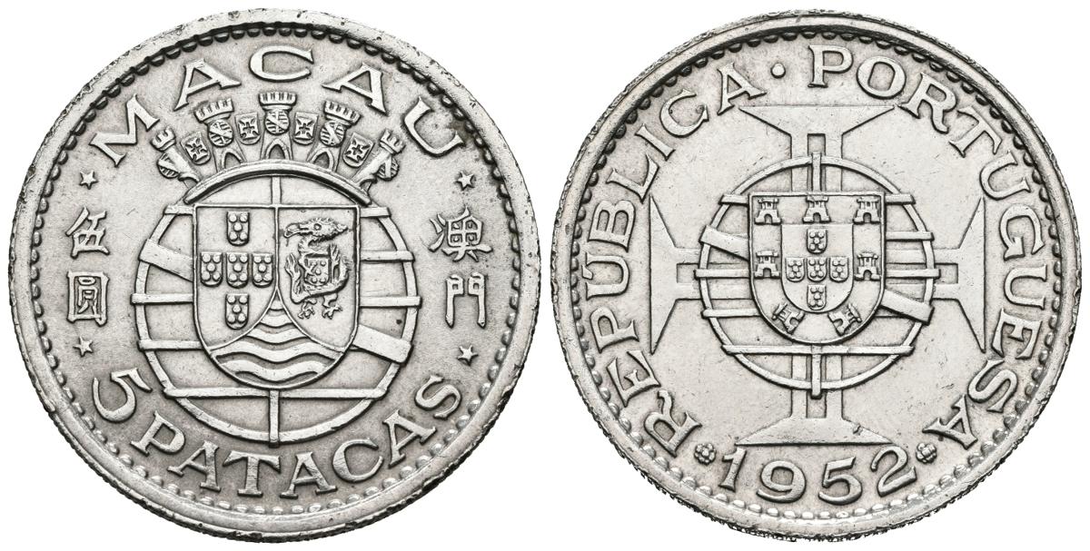 MACAO (Portugal). 5 Patacas. (Ar. 15,14g/31mm). 1952. (Km#5). EBC+