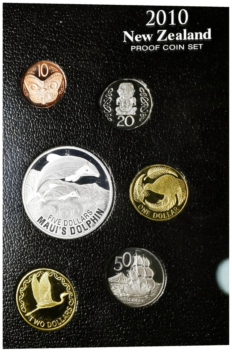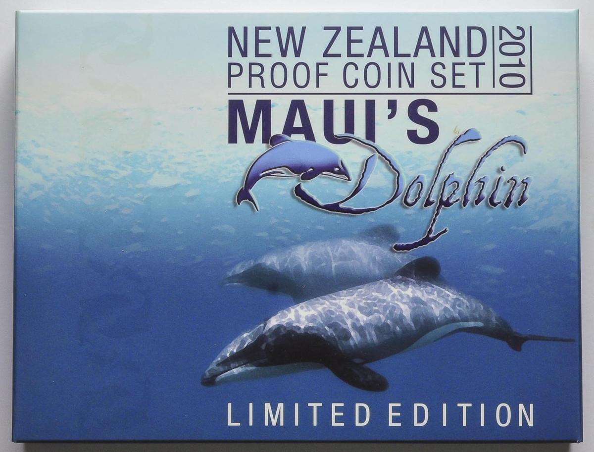 NUEVA ZELANDA. Set completo con los valores de 10 Cents, 20 Cents, 50 Cents, 1 Dollar, 2 Dollars y 5 Dollars. 2010. Set conmemorativo "MAUI'S DOLPHIN". PROOF. Presentado en estuche oficial con certificado.