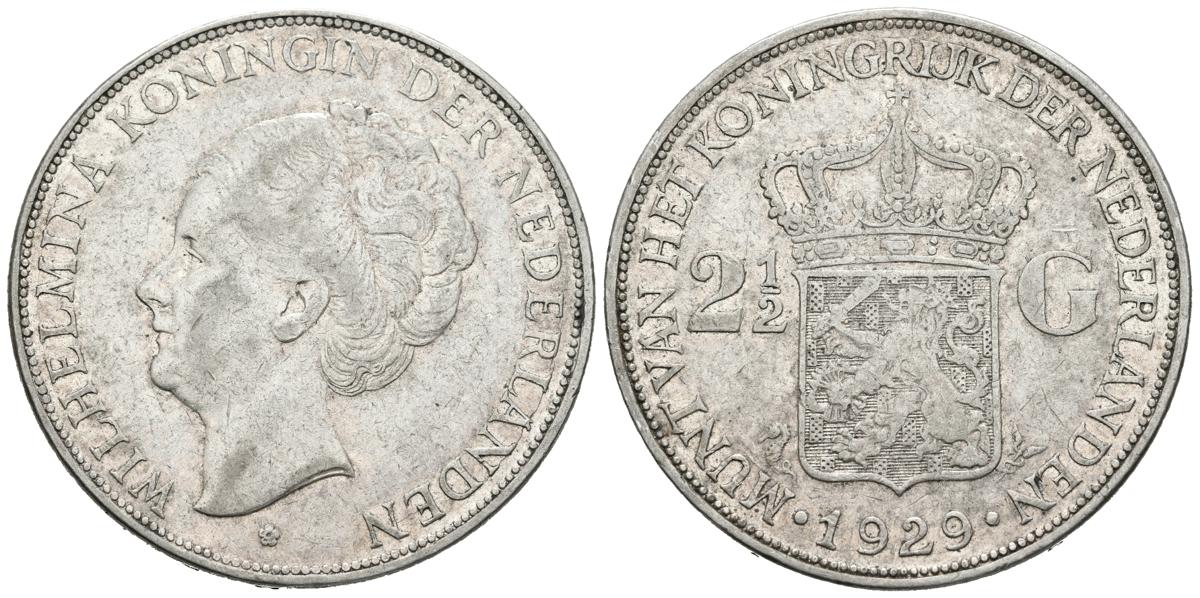 PAISES BAJOS. 2 1/2 Gulden. (Ar. 24,94g/38mm). 1929. Wilhelmina. (Km#165). MBC.