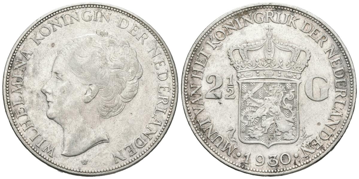PAISES BAJOS. 2 1/2 Gulden. (Ar. 24,90g/38mm). 1930. Wilhelmina. (Km#165). MBC.