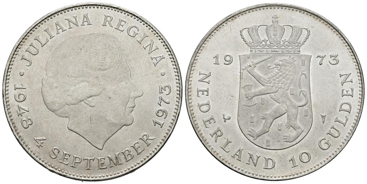 PAISES BAJOS. 10 Gulden. (Ar. 24,95g/38mm). 1973. 25 Aniversario del reinado de la reina Juliana. (Km#195). EBC+.