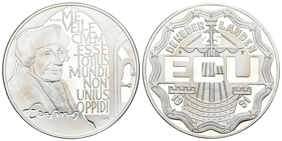 PAISES BAJOS. 25 Ecu (Ar. 25,08g/38mm). 1991. Desiderius Erasmus de Rotterdam. (Km#45). PROOF. Tirada de 30.000 unidades. Incluye estuche y certificado de autenticidad.