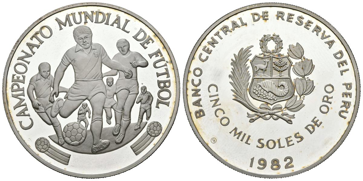 PERU. 5000 Soles. (Ar. 23,21g/38mm). 1982. Mundial de Fútbol ´82. (Km#284). PROOF.