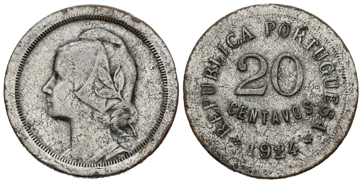 PORTUGAL. 20 Centavos. (Ae. 4,60g/19mm). 1924. (Km#574). MBC-. Moneda de cobre bañada en niquel.