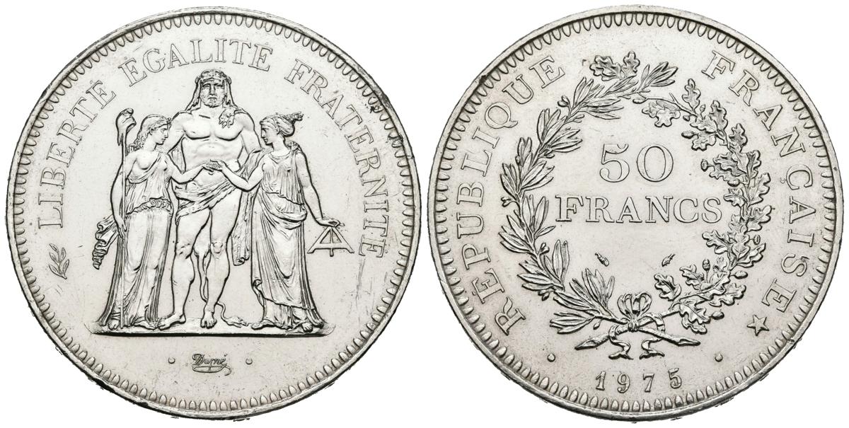 FRANCIA. 50 Francs. (Ar. 30,04g/41mm). 1975. Hércules. (Km#941). SC. Limpiada.