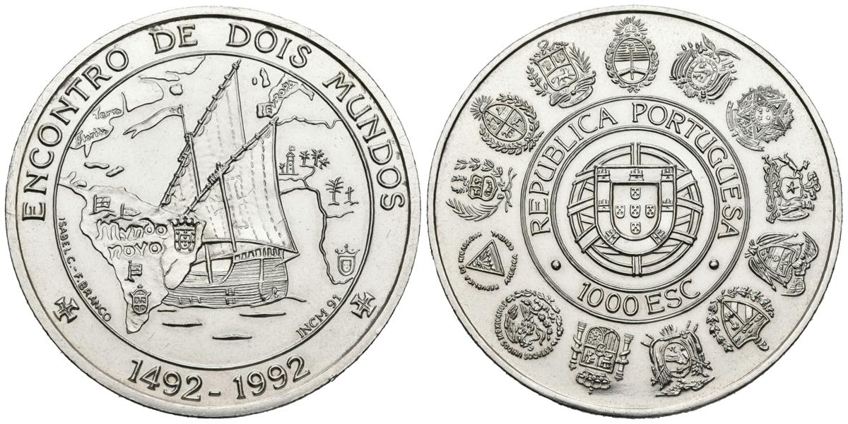 PORTUGAL. 1000 Escudos. (Ar. 26,89g/40mm). 1992. Encuentro entre los dos mundos.(Km#657a). PROOF.