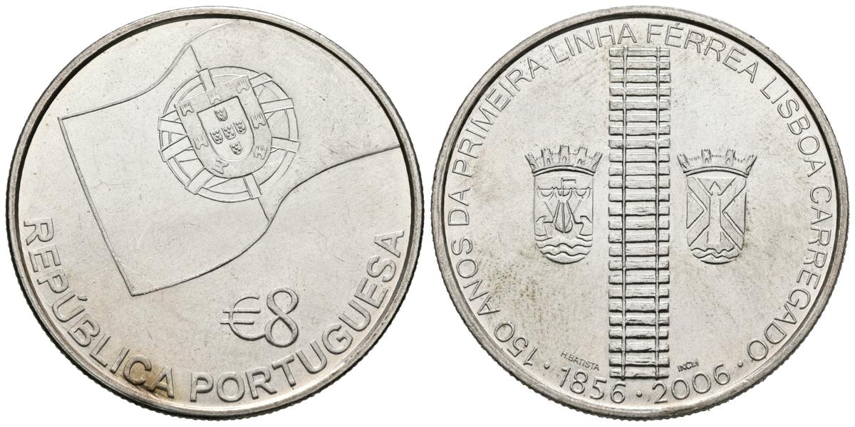 PORTUGAL. 8 Euros. (Ar. 21,05g/36mm). 2006. 150 Aniversario de la Primera Línea Ferrea Portuguesa. (Km#778). SC.