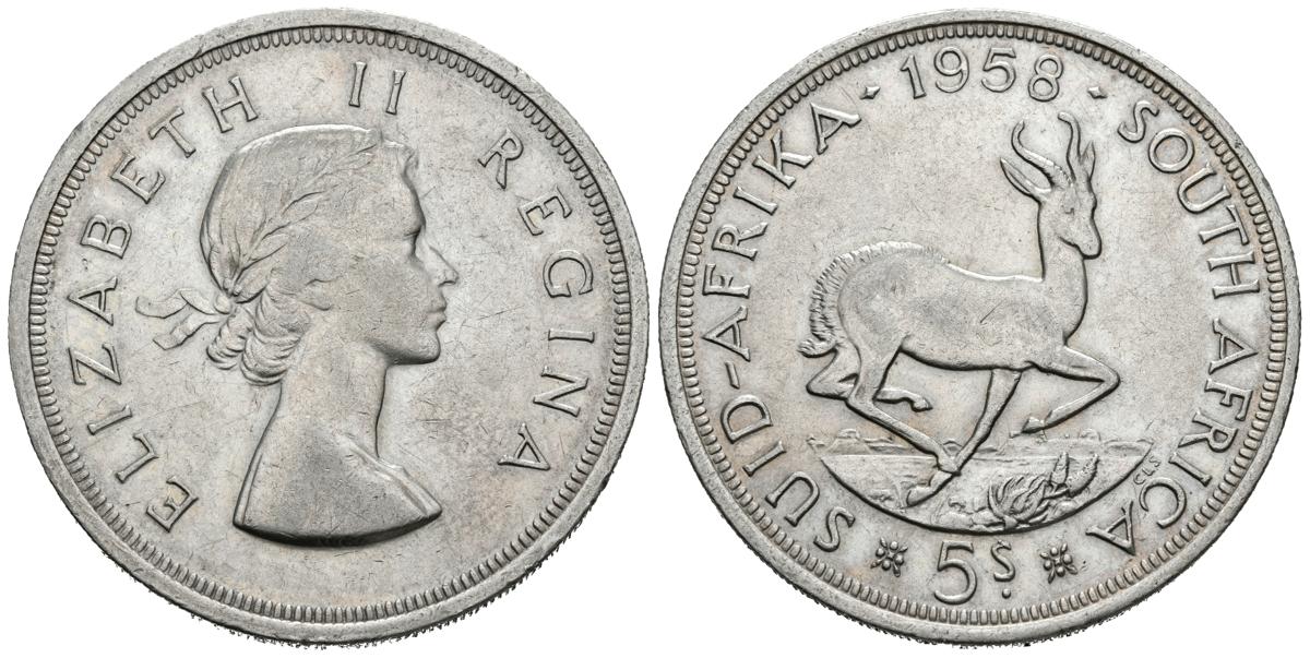 SUDAFRICA. 5 Schilling. (Ar. 28,29g/39mm). 1958. Elisabeth II. (Km#52). MBC+.