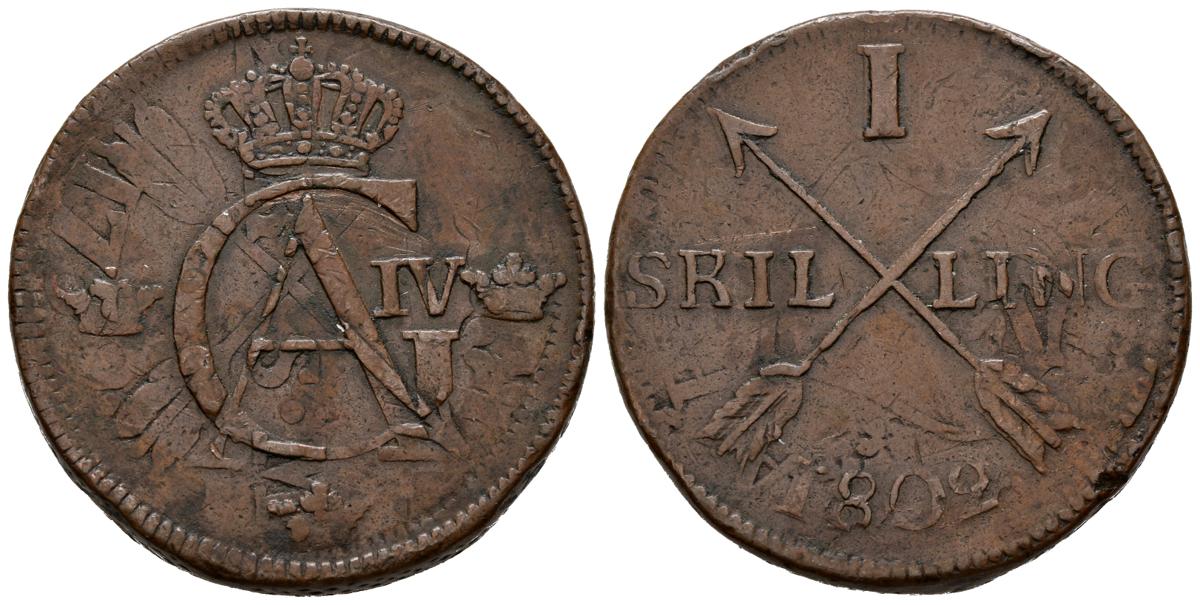 SUECIA. 1 Skilling. (Cu.27,81/33mm). 1802. (Km#566). Acuñado sobre cospel de 2 Ore de 1759. MBC.