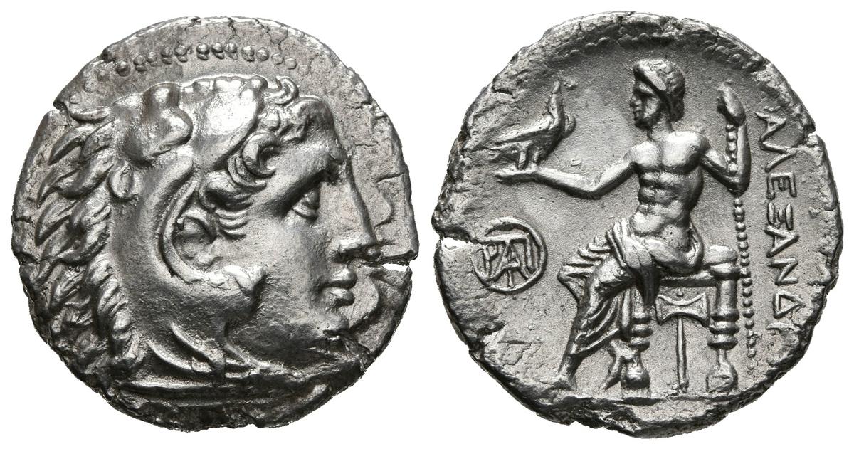 REYES DE MACEDONIA, Alejandro III, Magno. Dracma. (Ar. 3,58g/19mm). 336-323 a.C. Miletos. (Price 2148). Anv: Cabeza de Heracles a derecha con cabeza de leon. Rev: Zeus sentado a izquierda portando águila y cetro, delante monograma, debajo del trono labrys, detrás leyenda griega. EBC-.