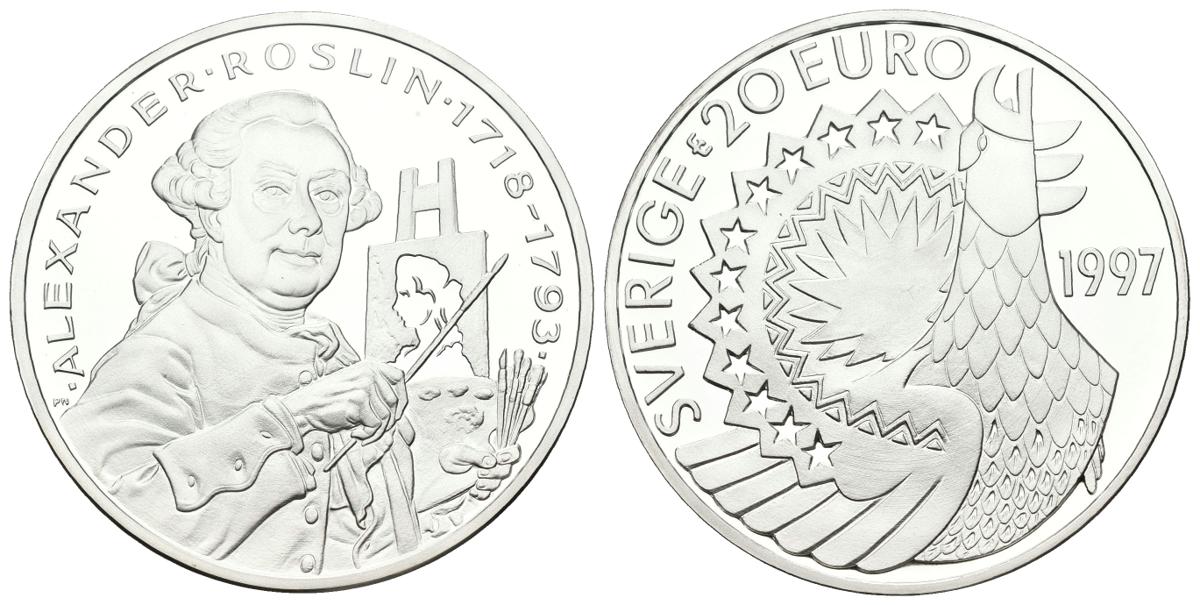 SUECIA. 20 Euro (Ar. 26,98g/36mm). 1997. Alexander Roslin. 1718-1793. PROOF. Incluye certificado de auntenticidad y estuche original. Prueba.