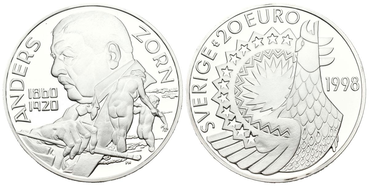SUECIA. 20 Euro (Ar. 26,98g/36mm). 1998. Anders Zorn. 1860-1920. PROOF. Incluye certificado de auntenticidad y estuche original. Prueba.