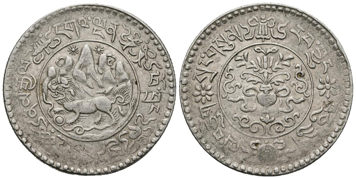 TIBET. 3 Srang. (Ar. 11,52g/31mm). 1937. León de las nieves mirando a la izquierda. En el centro la cordillera del Himalaya detrás dos soles arriba. (Km#26). MBC.