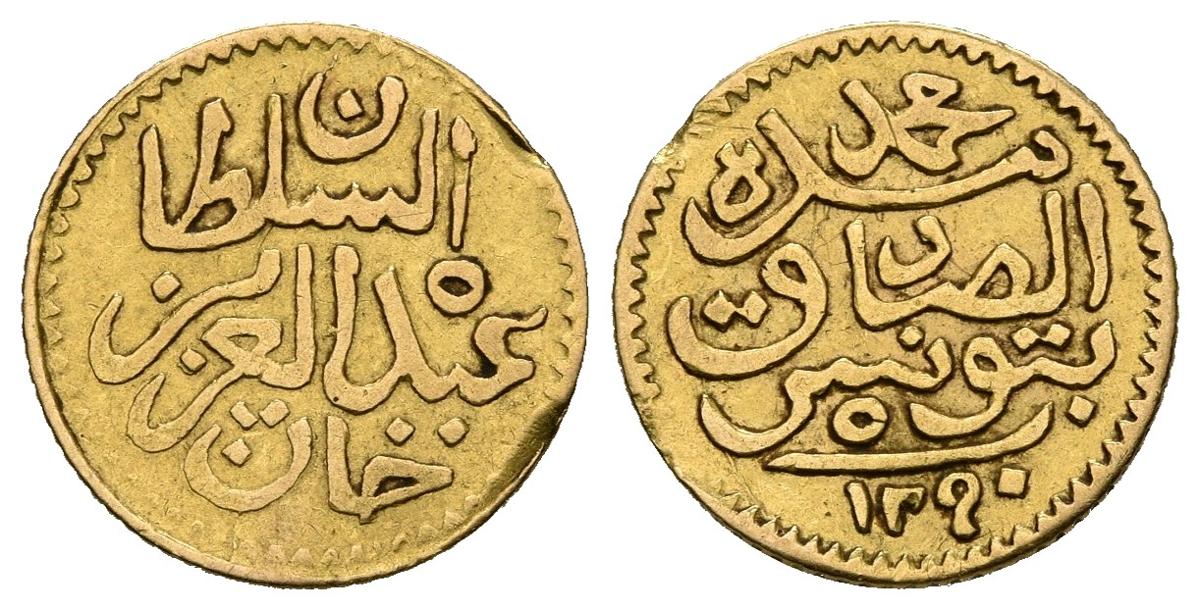 TUNEZ, Abd al-Aziz (1861-1876). 5 Piastras. (Au. 0,92g/13mm). 1290H. (Km#169). MBC.