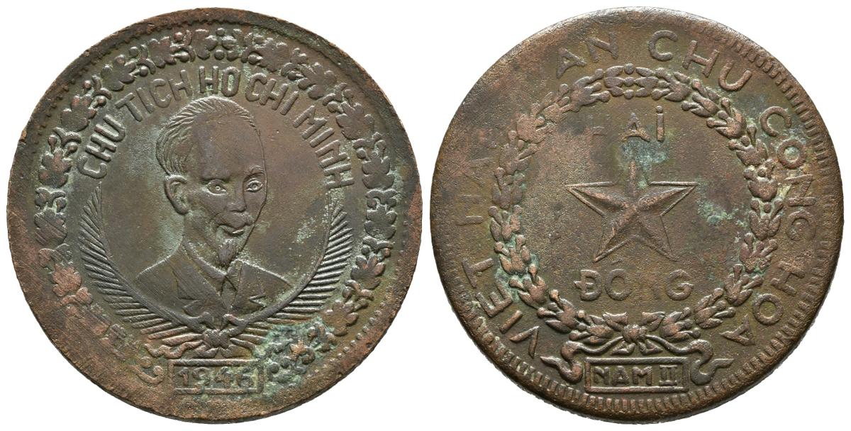 VIETNAM. 2 Dong (Ae. 11,60g/30mm). 1946. Chu Tich Ho Chi Minh. (Km#4). BC+. Escasa.