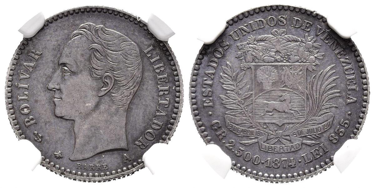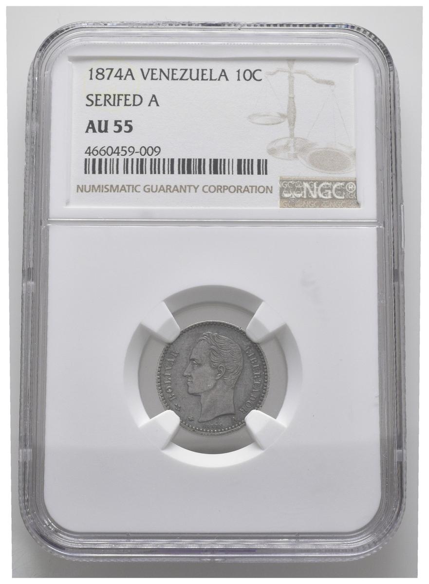 ESTADOS UNIDOS DE VENEZUELA. 10 Centavos. (Ar. 2,5g/18mm). 1874. París A. (Km#Y13.1). Variante "Sherifed A". Encapsulado NGC AU-55.