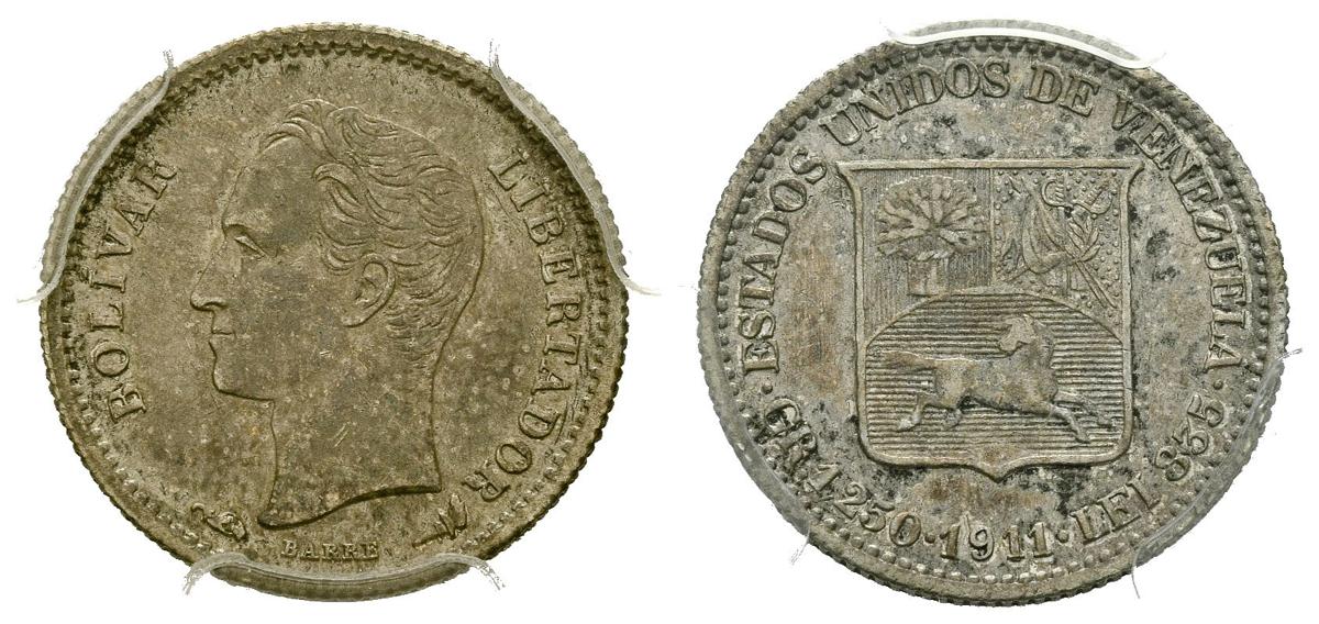 ESTADOS UNIDOS DE VENEZUELA. 1/4 Bolívar. (Ar. 1,25/15mm). 1911. (Km#Y20). Encapsulado PCGS AU-53.