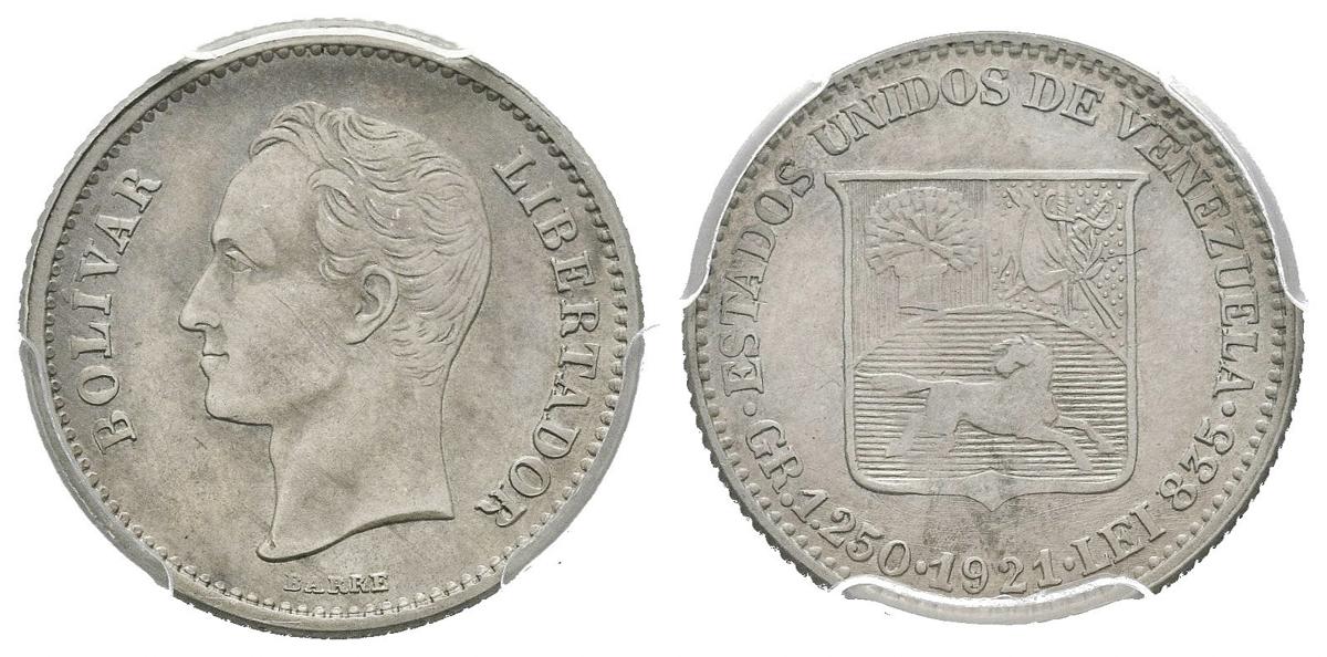 ESTADOS UNIDOS DE VENEZUELA. 1/4 Bolívar. (Ar. 1,25g/15mm). 1921. Philadelphia. (Km#Y20). Variante "Low 2". Encapsulado PCGS AU Details.