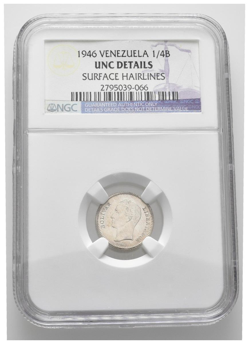 ESTADOS UNIDOS DE VENEZUELA. 1/4 Bolívar. (Ar. 1,25g/15mm). 1946. Philadelphia. (Km#Y20). Encapsulado NGC UNC Details. Rayitas.