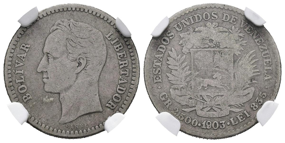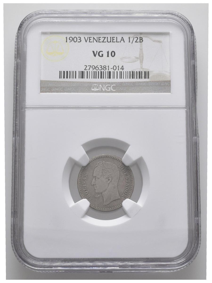 ESTADOS UNIDOS DE VENEZUELA. 1/2 Bolívar. (Ar. 2,50g/18mm). 1903. (Km#Y21). Encapsulado NGC VG-10.