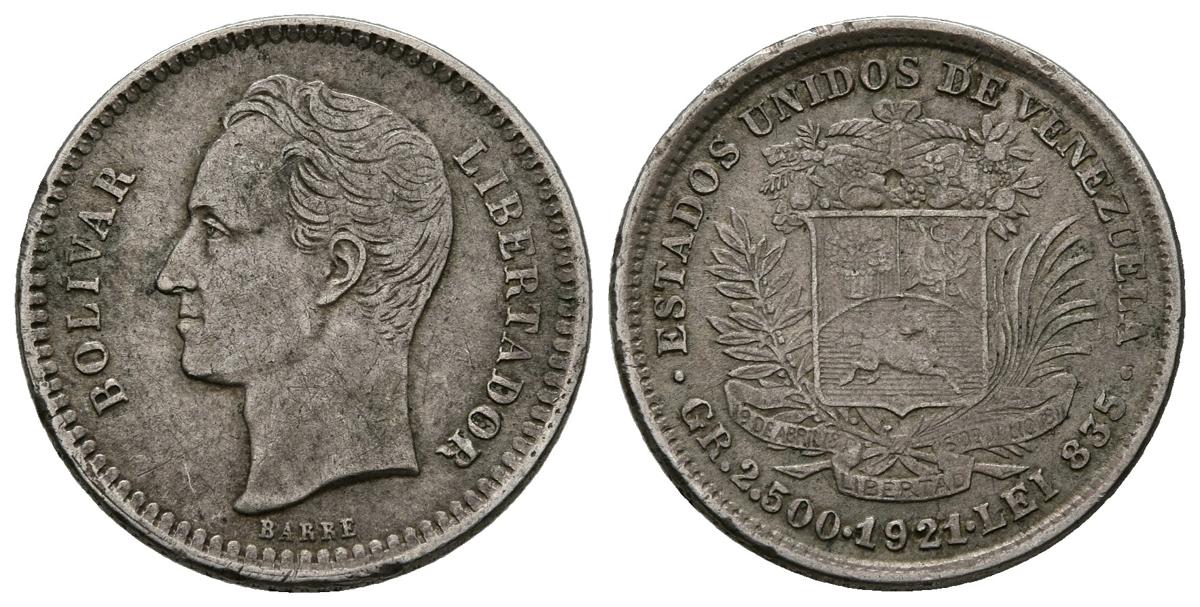 ESTADOS UNIDOS DE VENEZUELA. 1/2 Bolívar. (Ar. 2,48/18mm). 1921. Philadelphia. (Km#Y21). MBC+.