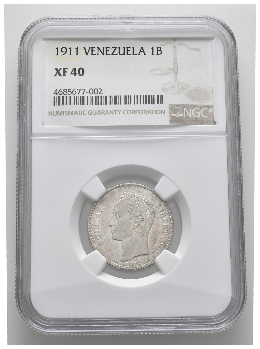 ESTADOS UNIDOS DE VENEZUELA. 1 Bolívar. (Ar. 5,00g/23mm). 1911. (Km#Y22). Encapsulado NGC XF-40.