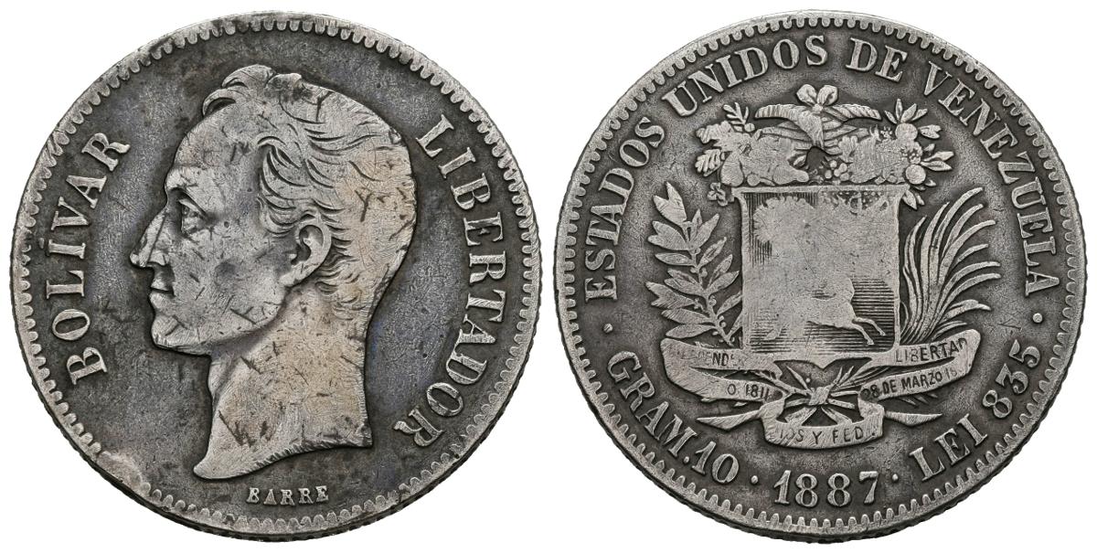 ESTADOS UNIDOS DE VENEZUELA. 2 Bolívares. (Ar. 9,75g/27mm). 1887. Caracas. (Km#23). MBC-/BC+. Preciosa pátina.
