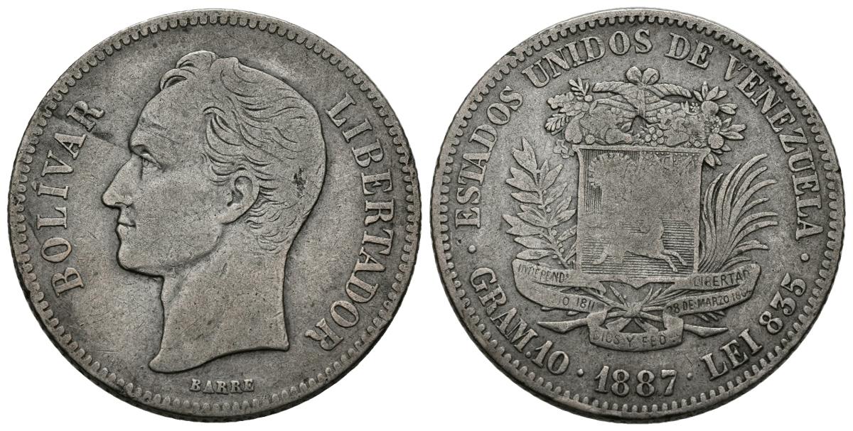 ESTADOS UNIDOS DE VENEZUELA. 2 Bolívares (Ar. 9,88g/27mm). 1887. Caracas. (Km#23). MBC-.
