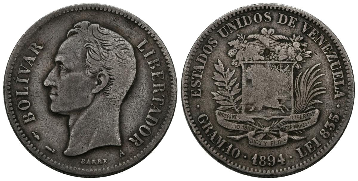 ESTADOS UNIDOS DE VENEZUELA. 2 Bolívares (Ar. 9,69g/27mm). 1894. París. (Km#23). MBC-. Bonita pátina oscura. Vanos de acuñación.