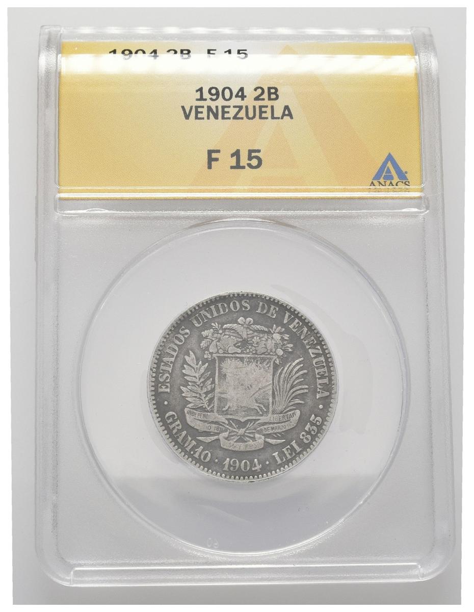 ESTADOS UNIDOS DE VENEZUELA. 2 Bolívares. (Ar. 10,00g/27mm). 1904. Philadelphia. (Km#Y23). Encapsulado ANACS F-15.