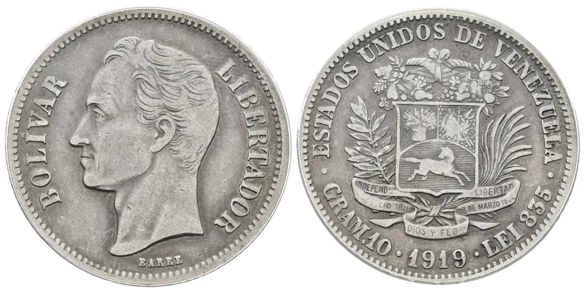 ESTADOS UNIDOS DE VENEZUELA. 2 Bolívares. (Ar. 10,00g/27mm). 1919. Philadelphia. (Km#Y23). Encapsulado ANACS VF-30.