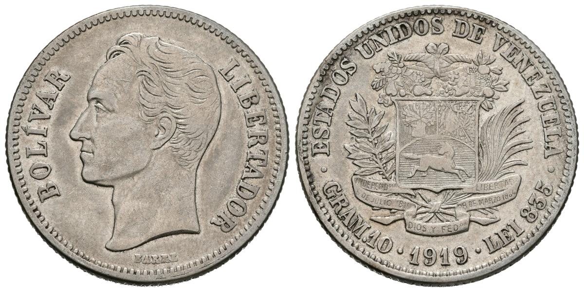 ESTADOS UNIDOS DE VENEZUELA. 2 Bolívares. (Ar. 9.89g/27mm). 1919. París. (Km#Y23). MBC+