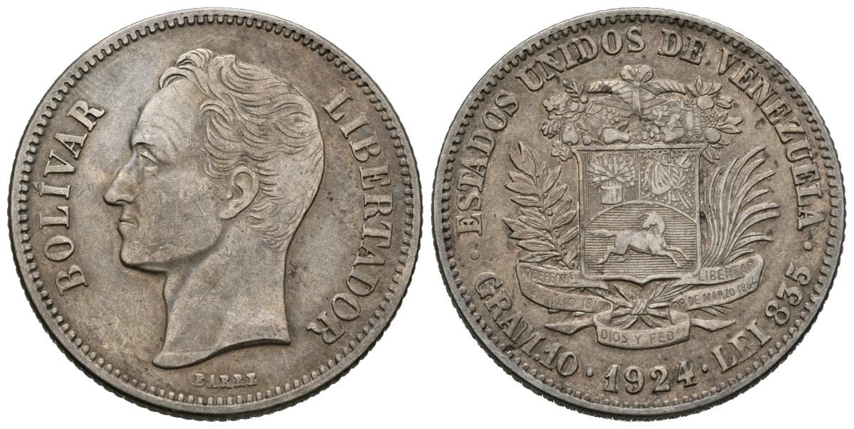 ESTADOS UNIDOS DE VENEZUELA. 2 Bolívares. (Ar. 9,87g/27mm). 1924. Philadelphia. (Km#Y23). MBC+.