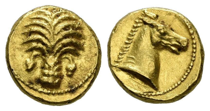 ZEUGITANIA, Cártago. 1/10 shekel. (Au. 1,00g/8mm). 350-320 a.C. Anv: Palmera. Rev: Cabeza de caballo a derecha. (SNG Copenhagen 132). EBC. Bonito y raro ejemplar.