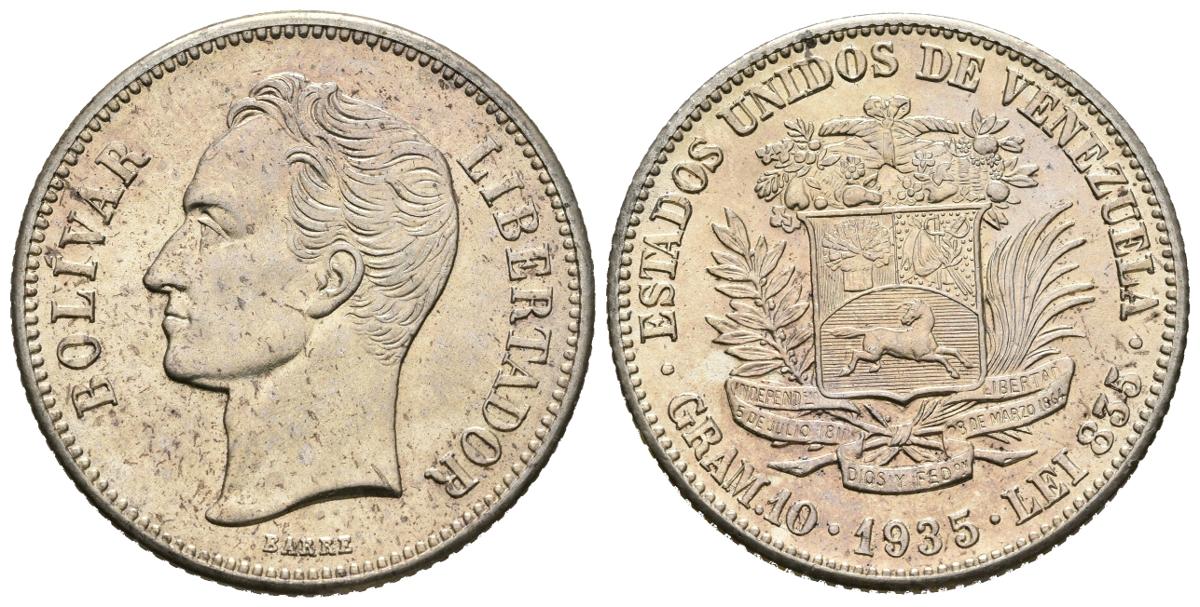 ESTADOS UNIDOS DE VENEZUELA. 2 Bolívares. (Ar. 10,00g/27mm). 1935. Philadelphia. (Km#Y23). SC. Marquitas. Preciosa pátina.