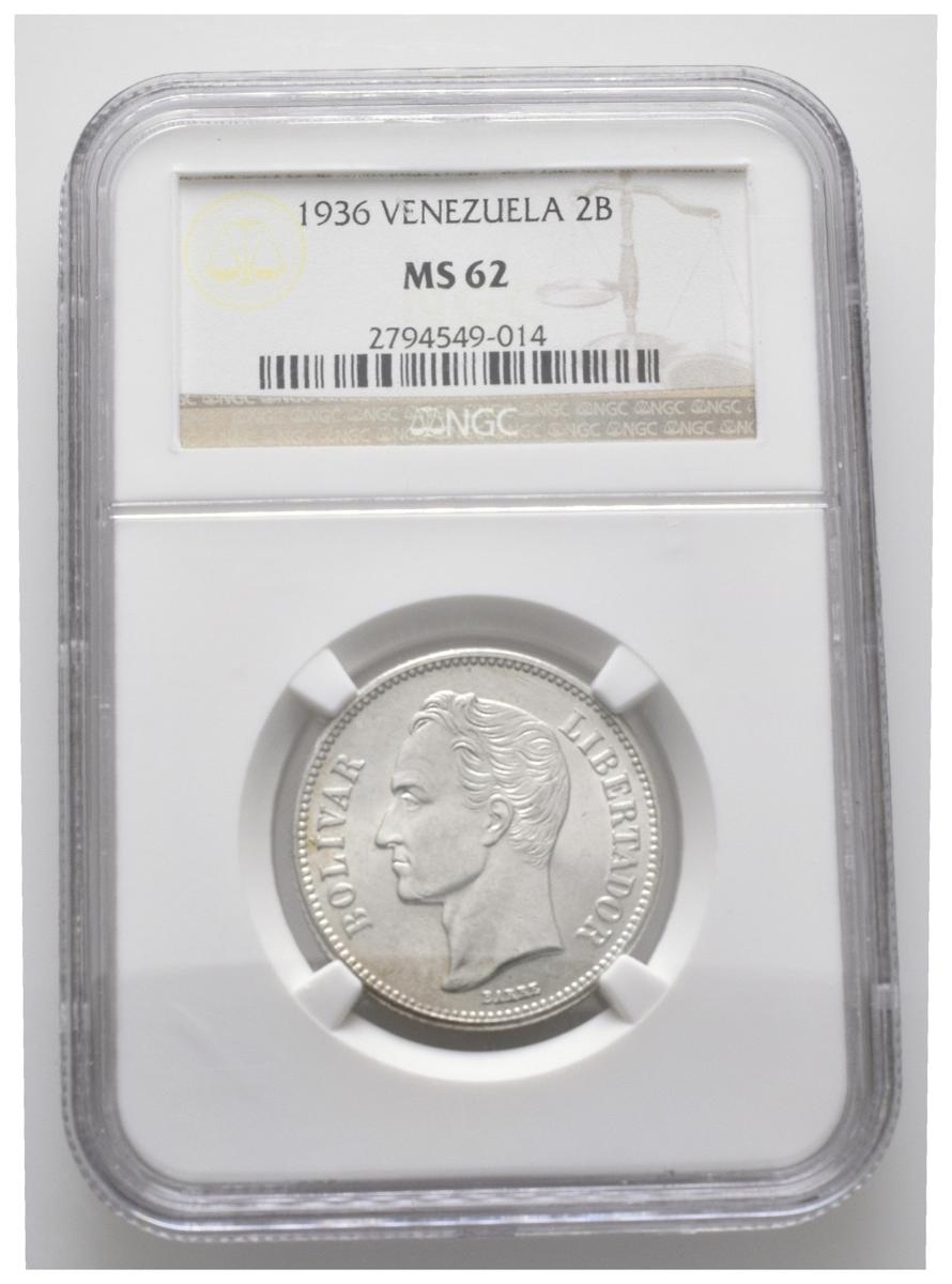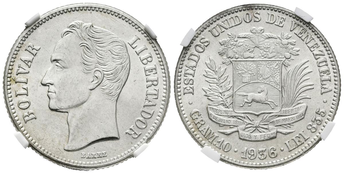 ESTADOS UNIDOS DE VENEZUELA. 2 Bolívares. (Ar. 10,00g/23mm). 1936. Philadelphia. (Km#Y23). Encapsulado NGC MS-62.