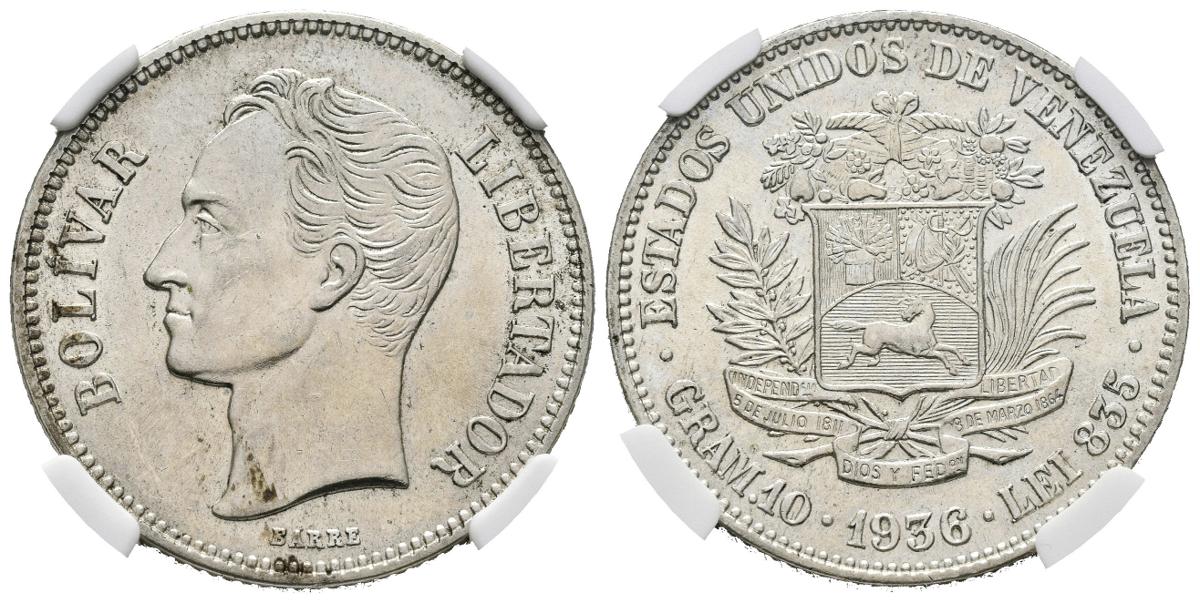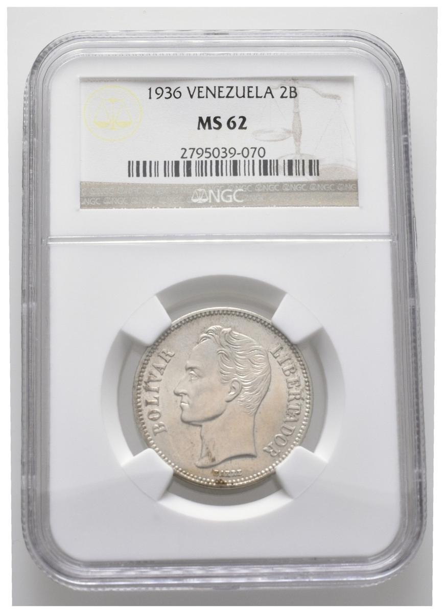 ESTADOS UNIDOS DE VENEZUELA. 2 Bolívares. (Ar. 10,00g/27mm). 1936. Philadelphia. (Km#Y23). Encapsulado NGC MS-62.