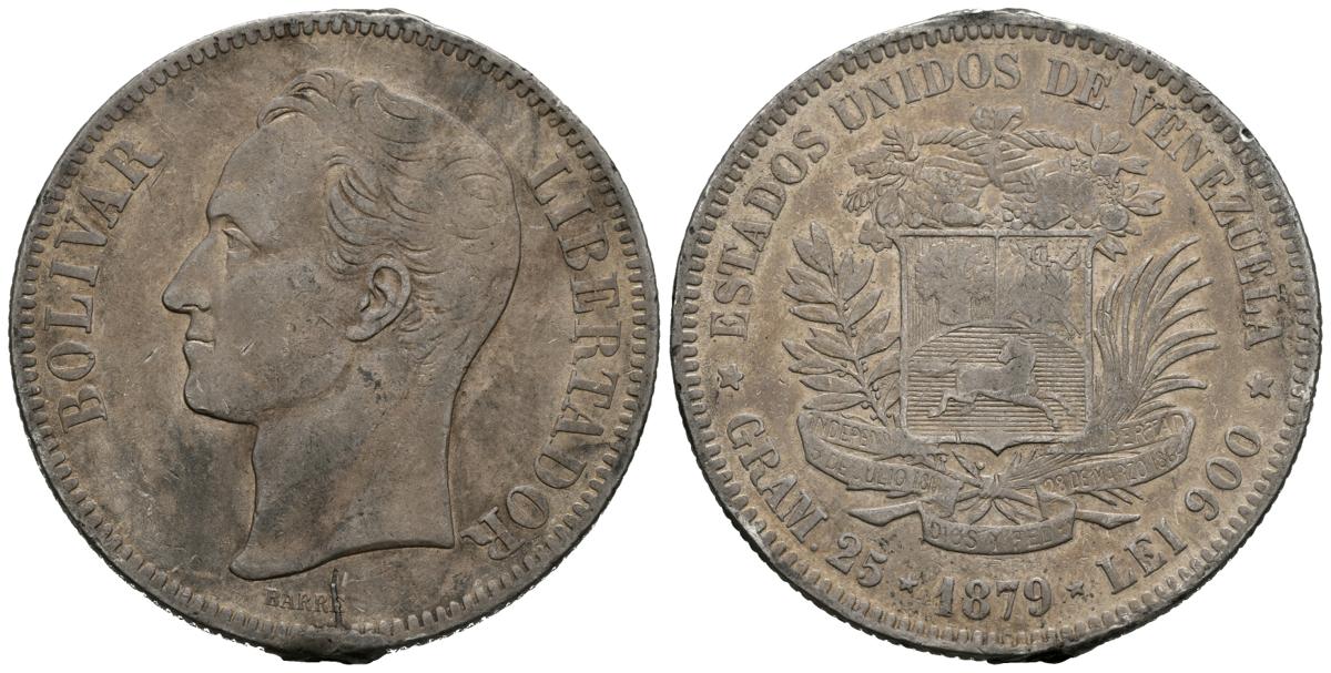 ESTADOS UNIDOS DE VENEZUELA. 5 Bolívares. (Ar. 24,64g/37mm). 1879 (primer año de esta serie). Bruselas. (Km#Y24.1). MBC-. Soldaduras en el canto.