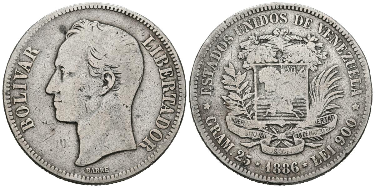 VENEZUELA. 5 Bolívares. (Ar. 24,38g/37mm). 1886. Caracas. (Km#Y24.1). MBC-.