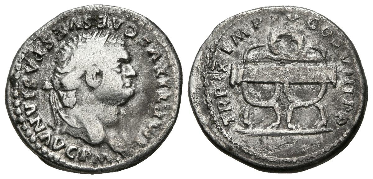 TITO. Denario. (Ar. 3,12g/18mm). 80 d.C. Roma. (RIC 25a). Anv: Busto laureado de Tito a derecha, alrededor leyenda: IMP TITVS CAES VESPASIAN AVG P M. Rev: Corona sobre silla curul, alrededor leyenda: TR P IX IMP XV COS VIII P P. MBC-.
