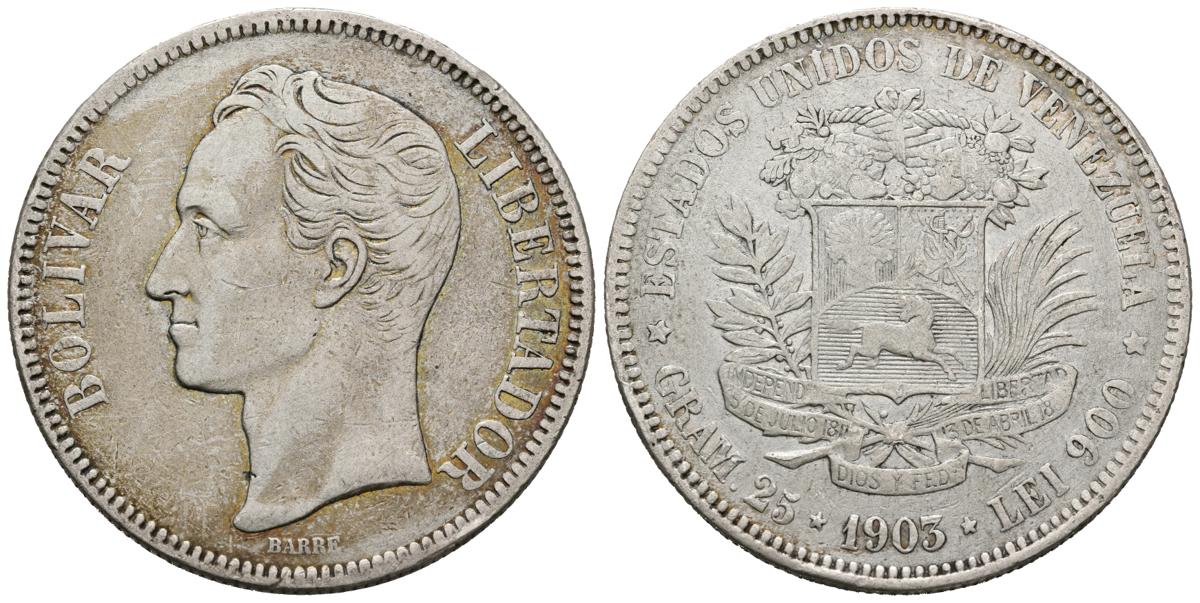 ESTADOS UNIDOS DE VENEZUELA. 5 Bolívares. (Ar. 24,79g/37mm). 1903. Philadelphia. (Km#Y24.2). MBC.