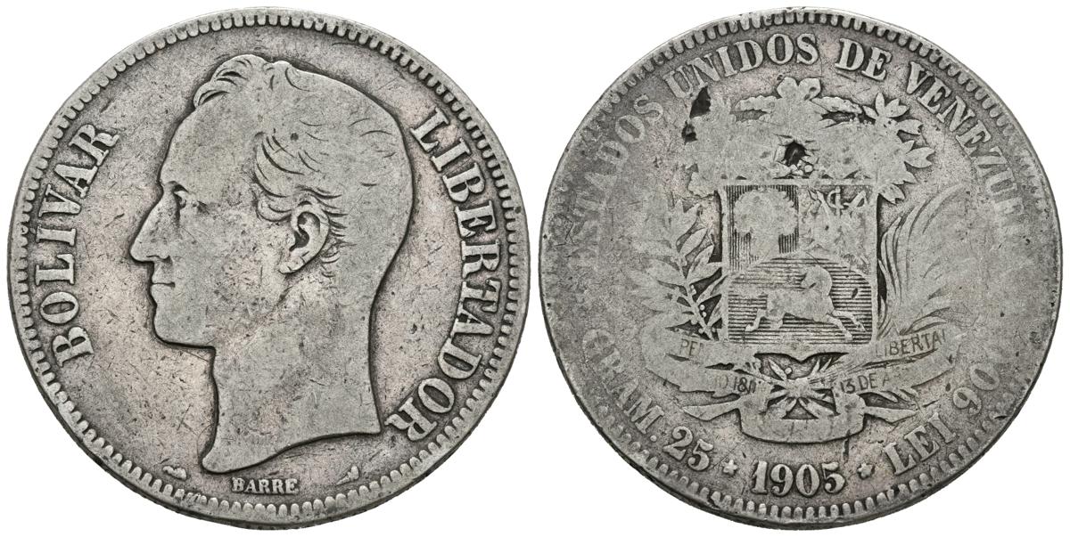 ESTADOS UNIDOS DE VENEZUELA. 5 Bolívares. (Ar. 24,16g/37mm). 1905. Caracas. (Km#Y24.2). MBC-.