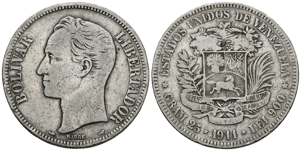 ESTADOS UNIDOS DE VENEZUELA. 5 Bolívares. (Ar. 24,63g/37mm). 1911. Caracas. (Km#Y24.2). MBC.