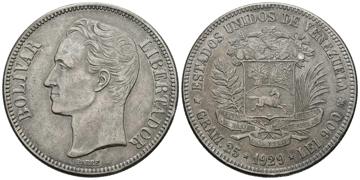 ESTADOS UNIDOS DE VENEZUELA. 5 Bolívares. (Ar. 24,84/37mm). 1929. Philadelphia. (Km#Y24.2). MBC.