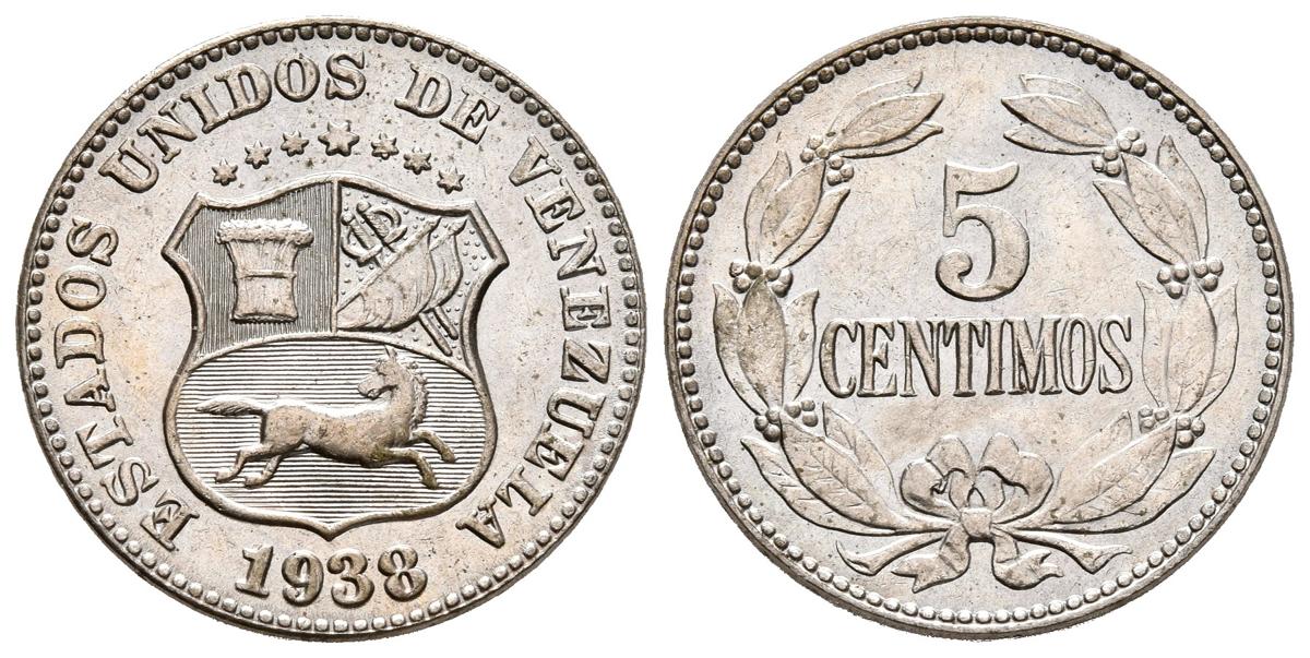 ESTADOS UNIDOS DE VENEZUELA. 5 Céntimos. (CuNi. 2,30g/19mm). 1938. Philadelphia. (Km#Y27). SC-.