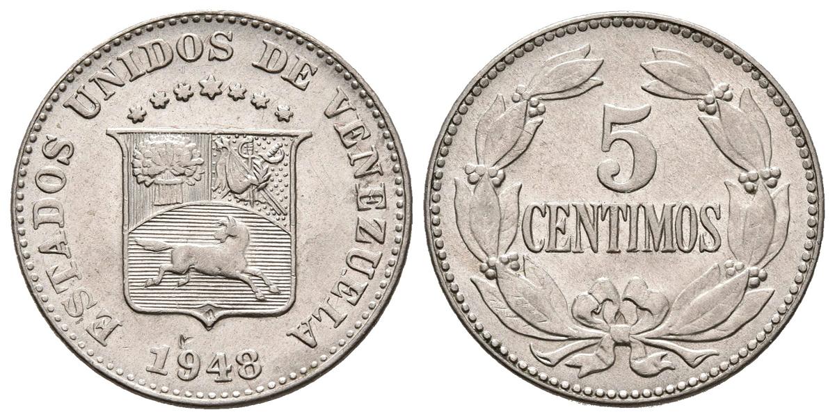 ESTADOS UNIDOS DE VENEZUELA. 5 Céntimos. (CuNi. 2,40g/19mm). 1948. Philadelphia. (Km#Y29a). EBC+.