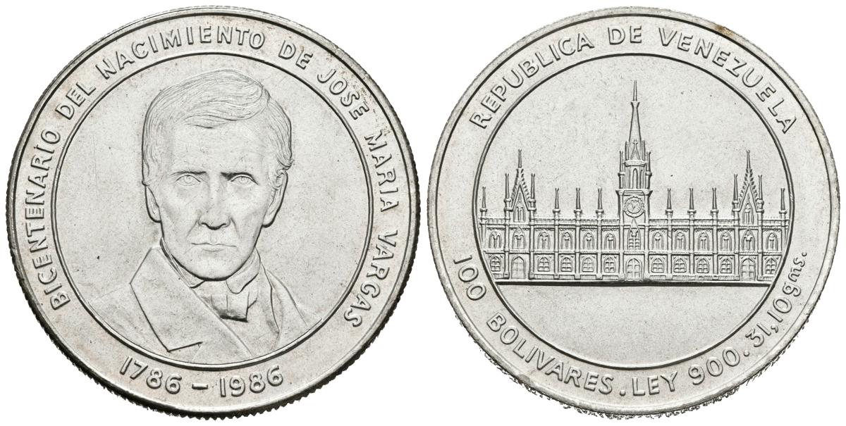REPUBLICA DE VENEZUELA. 100 Bolívares. (Ar. 31,26g/34mm). 1986. 200 Aniversario del nacimiento de José María Vargas. (Km#Y60). SC.