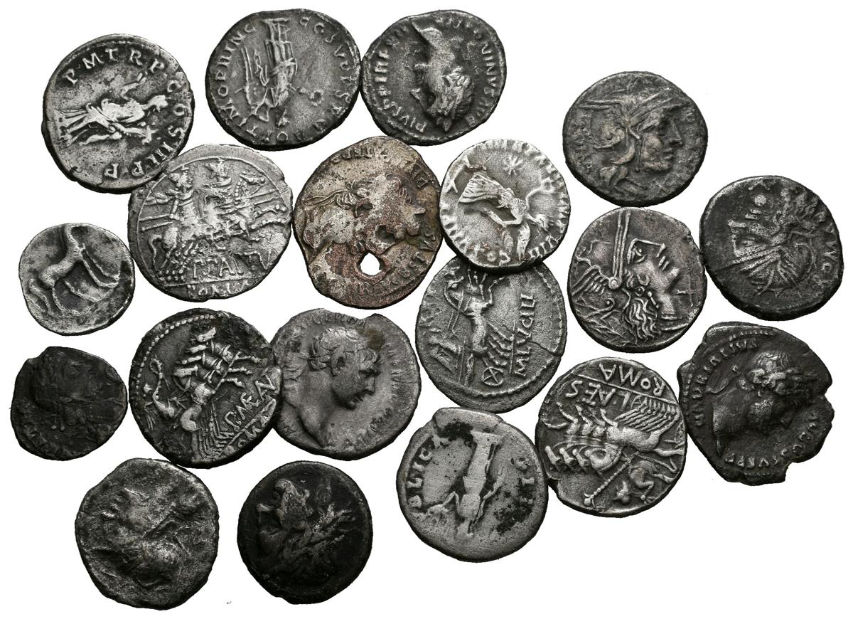 IMPERIO ROMANO. Lote compuesto por 19 piezas de plata de diferentes módulos, épocas, emperadores y calidades. Algunos de ellos forrados. A EXAMINAR.